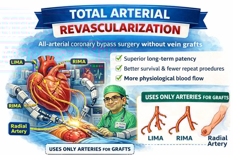 Total arterial revascularization through minimally invasive surgery uses only arterial grafts via small incisions, avoiding sternotomy. This advanced approach offers superior long-term graft patency, reduced pain, faster recovery, and excellent outcomes compared to conventional bypass surgery.